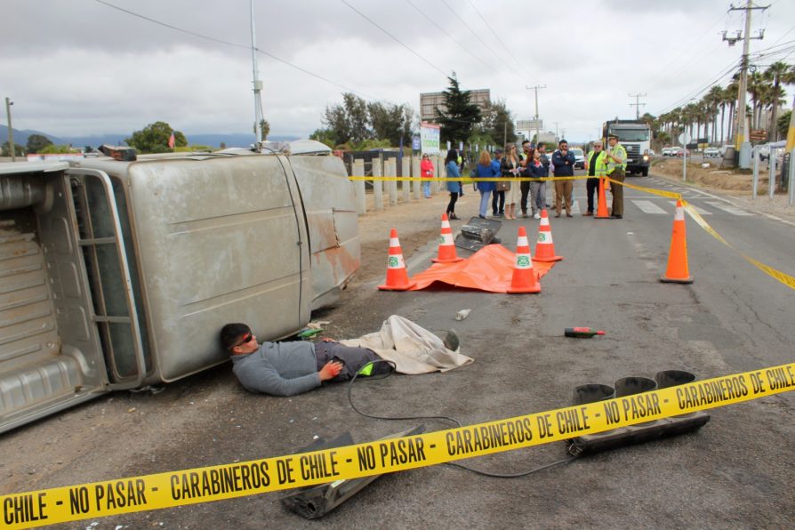 Este lunes y en el sector de la caletera del kilómetro 465 de la comuna de Coquimbo, se llevó a cabo un simulacro de siniestro vial, accidentes que en el año cobran la vida de alrededor de 2 mil personas, los cuales son provocados principalmente por exceso de velocidad, consumo de alcohol y drogas, y distracciones como la manipulación de celulares, a lo que se suman el transitar sin cinturón de seguridad, y niños y niñas que no van en un sistema de retención infantil bien instalado.